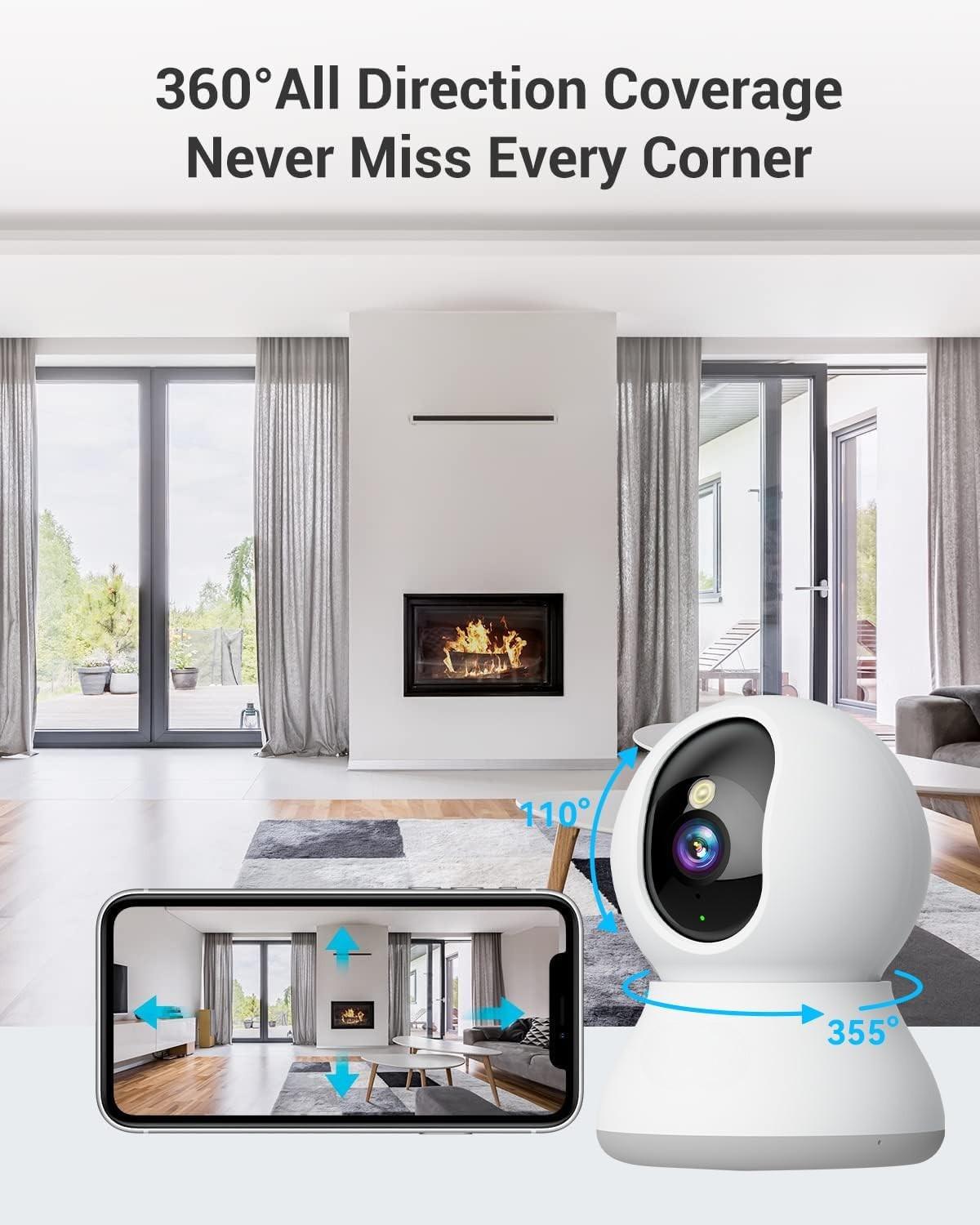Equipped with motion detection, the camera automatically follows movement and sends real-time alerts to your smartphone. The color night vision and infrared mode ensure visibility day or night, while the two-way talk feature allows you to listen and speak through the built-in microphone and speaker—perfect for checking on pets, children, or home security.